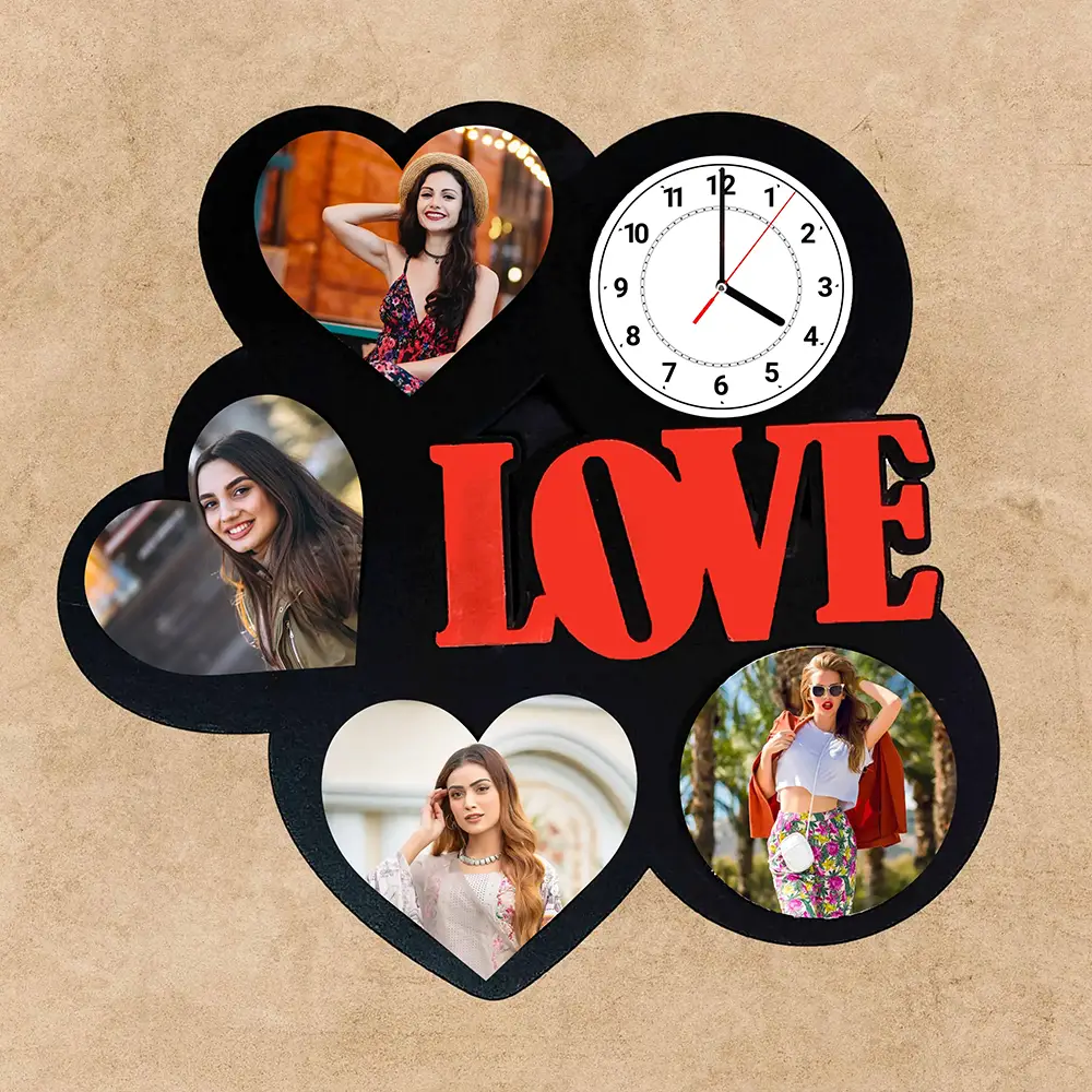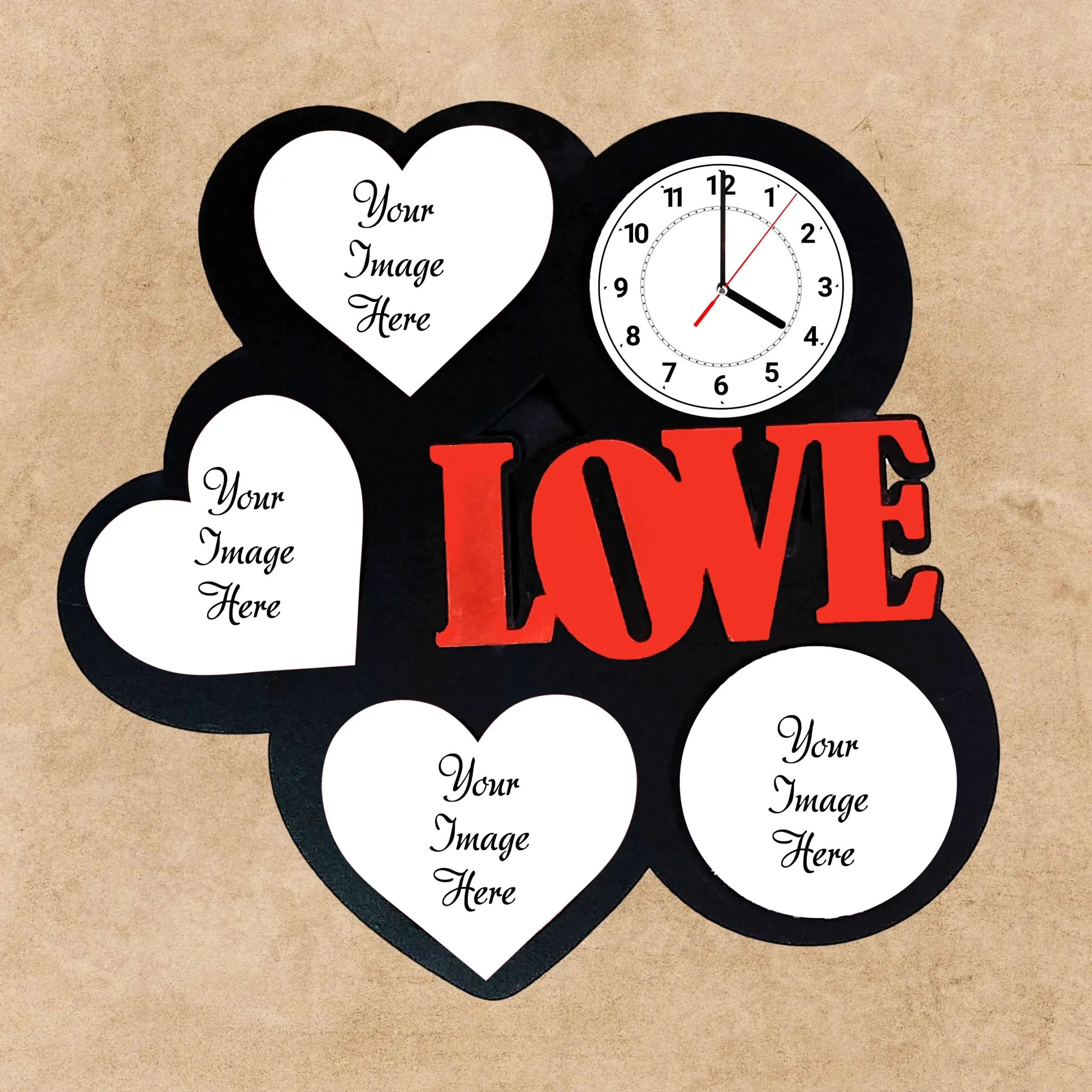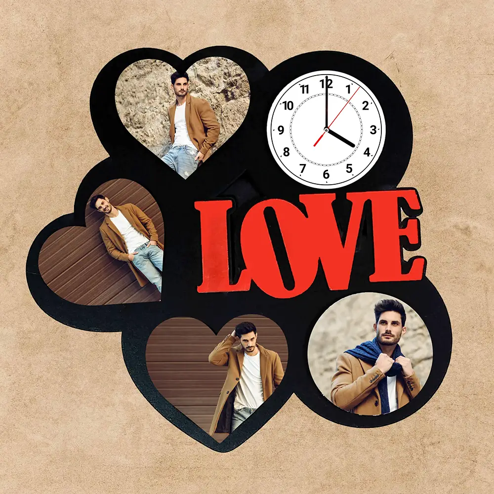 Celebrate love and memories with the MDF Wall Clock WC-15 by IGIFTZI. Featuring a bold LOVE acrylic symbol, sublimation-printed clock dial, and space for 3 heart-shaped and 1 round photo prints, this personalized wall clock makes the perfect decorative and gifting item for anniversaries, weddings, and housewarming.